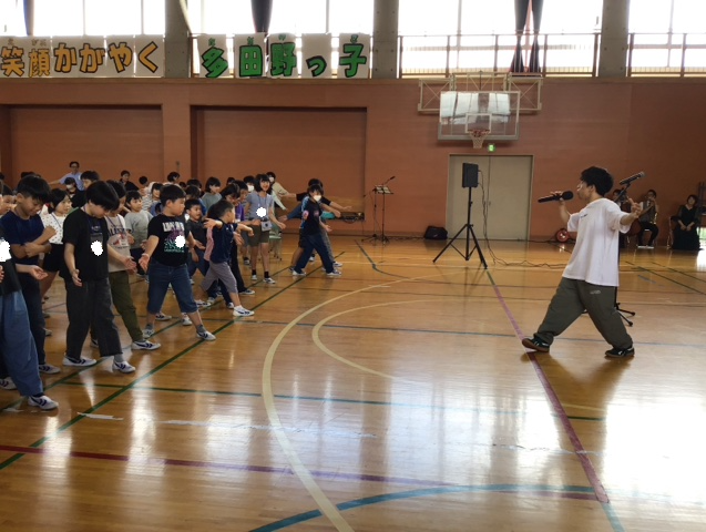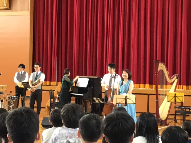 楽器の紹介やブレイクダンス体験、歌詞に関するクイズなど盛りだくさんの内容でした。体育館に響く音楽に、子どもたちはうっとり…。とても素敵な時間となりました。「もっと聴いていたい!」「ハープの音色がきれいだった!」と子どもたちは笑顔で話しています。