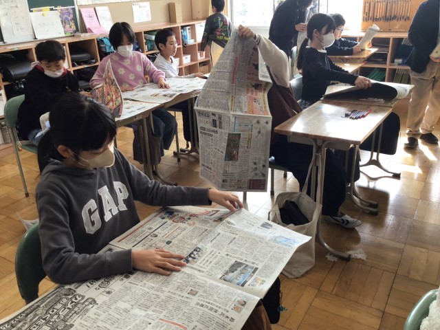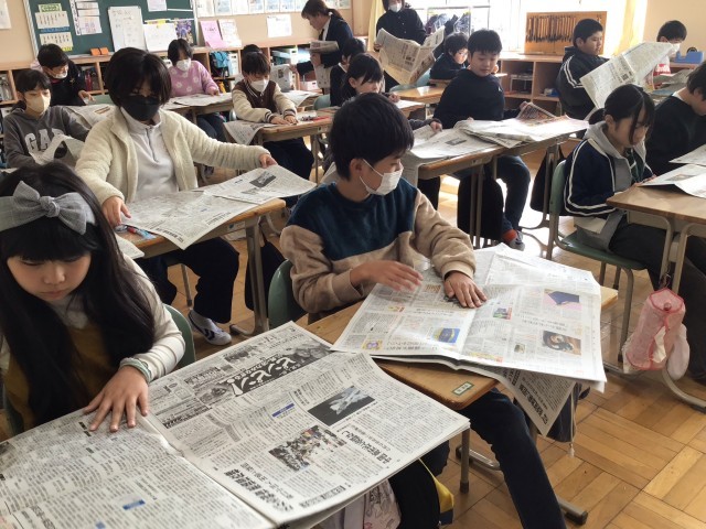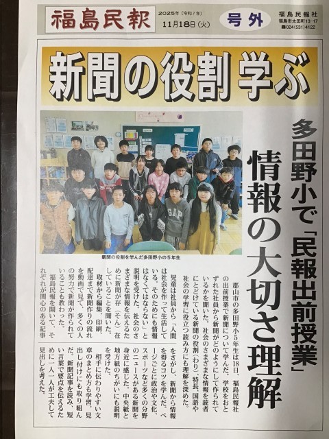 福島民報社職員の方を講師にお迎えし、5年生が民報出前授業を行いました。初めに取材から編集、印刷、配達までの新聞づくりの流れを教えていただきました。その後、実際に新聞を手に取り、新聞から情報を得るコツを学びました。また、相手に伝わりやすい文章のまとめ方や見出しの付け方についても学びました。