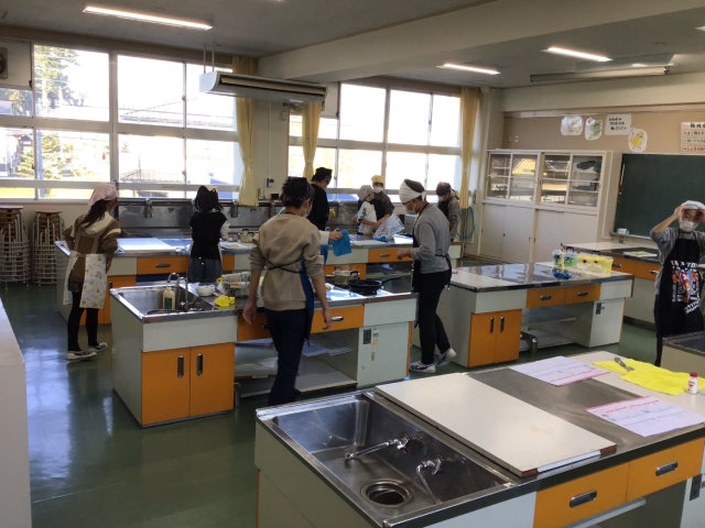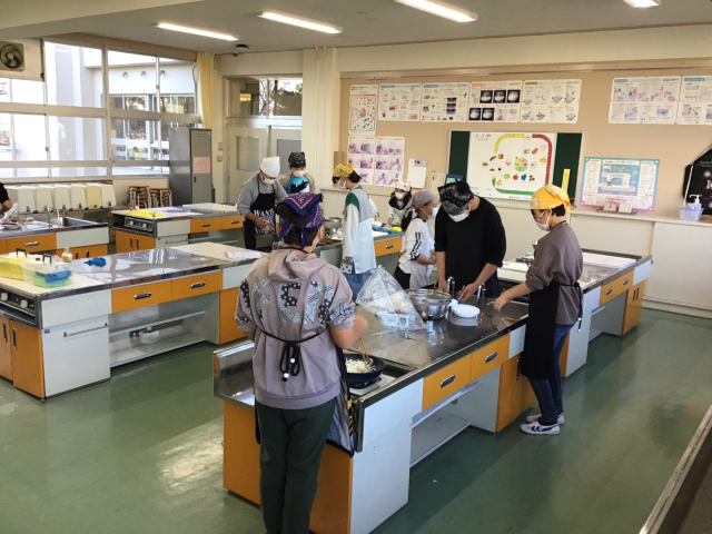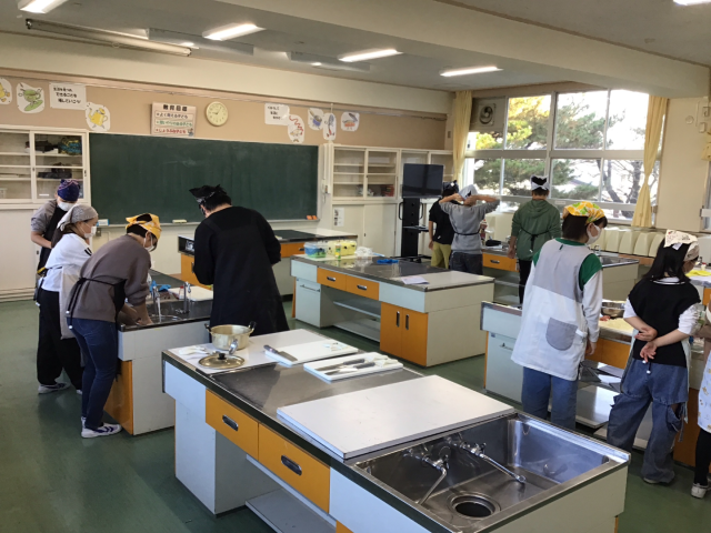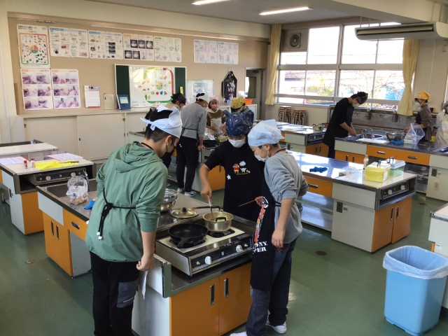 今回は、「ジャーマンポテト」を作りました。じゃが芋をゆで、切った玉ねぎとベーコンと炒め、塩とこしょうで味を付けました。じゃが芋のゆで加減、味の付け方もよく、どの班も上手に作れました。「おいしい、家でも作ってみたい。」の声が上がりました。