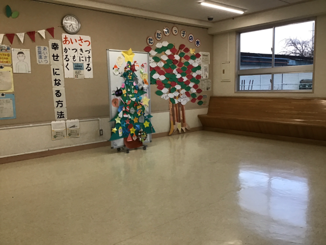 12月の多田野小学校の昇降口です。環境委員会が制作している「ただのっ子の木」には、全校生の「冬休みに楽しみなこと」の葉っぱがたくさんです。運営委員会が設置したツリーには、みんなが作ってくれたすてきな飾りがたくさんです。各委員会の活動で、明るい昇降口になっています。