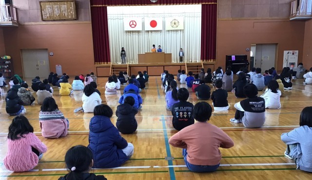 3学期始業式を行いました。全校生107名全員がそろって最高のスタートを切ることができました。児童の作文発表では、「漢字の勉強をがんばりたい。」「なわとび記録会へ向けて練習をがんばりたい。」「最高学年になる準備をしっかりと行う。」などの目標を発表していました。3学期もみんなで力を合わせて楽しい学校にしていきたいと思います。
