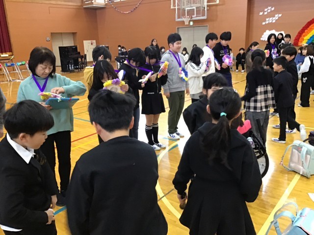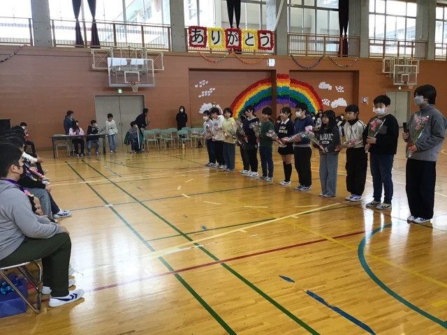 本日2,3校時に6年生をおくる会が行われました。様々な工夫を凝らした学年ごとの発表がありました。1年生は「イイじゃん」のダンスを披露。2年生はなわとびの発表の後、6年生といっしょに長縄跳びを楽しみました。3年生はメダルのプレゼントや「カリスマックス」のダンス、4年生は「ダンスホール」のダンスや6年生といっしょのゲーム。最後には5年生から6年生一人一人に向けたメッセージと花束贈呈がありました。素敵な6年生に感謝の気持ちを伝えることができた心温まる会になりました。
