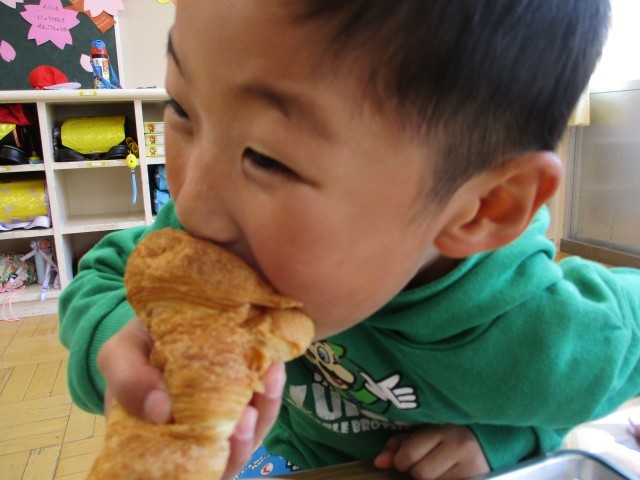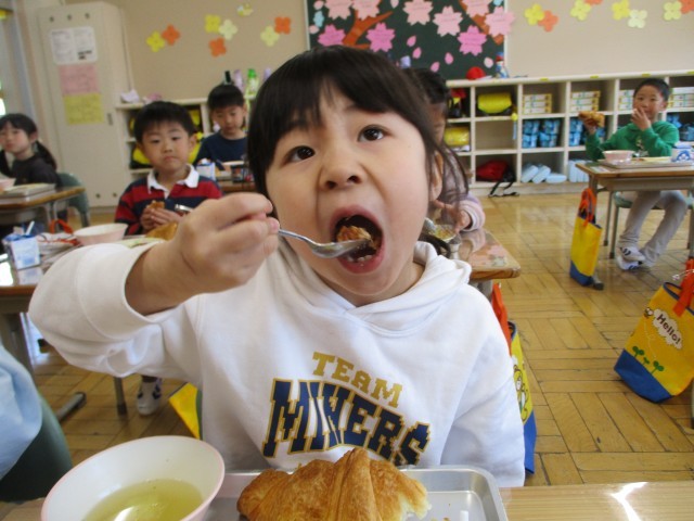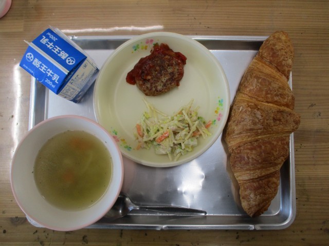 令和8年度の給食が開始されました。献立は「コンソメスープ、クロワッサン、サラスパサラダ、ハンバーグ、牛乳」です。1年生は小学校初めての給食です。自分の顔と同じくらいのふわふわなクロワッサンをおいしくいただきました。