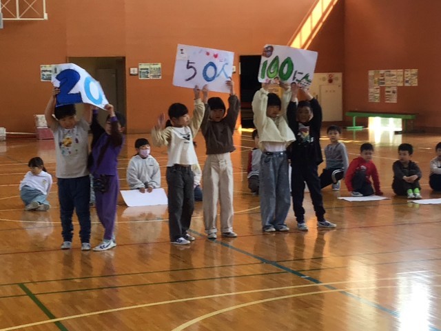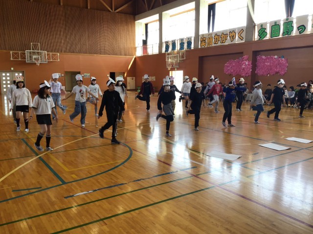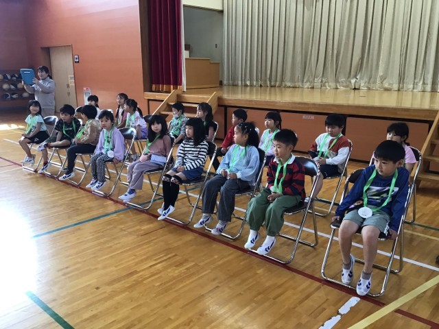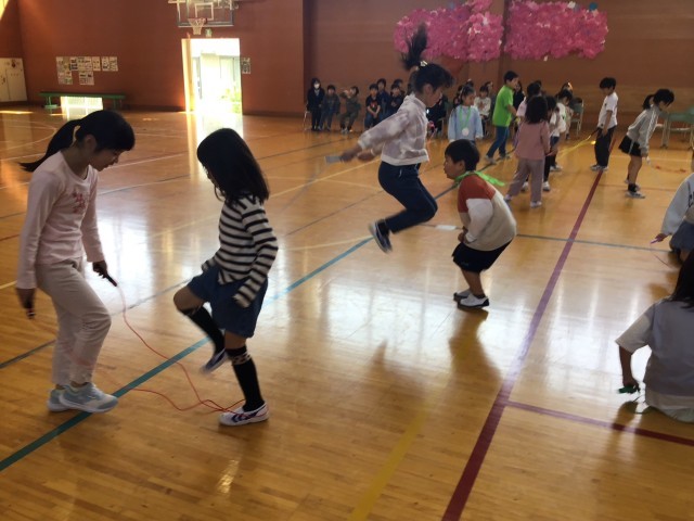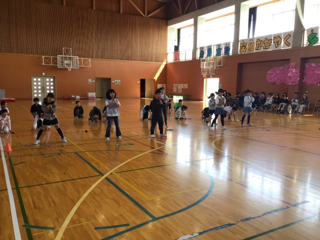 一年生を迎える会を行いました。校長の話、6年生代表のあいさつの後、各学年の発表です。歌やダンス、クイズ、一緒になわとびなどで一年生と楽しい時間を過ごしました。