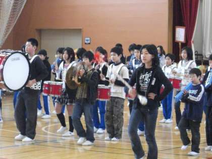6年生を送る会終了後、鼓笛移杖式が行われました。6年生の演奏の後、主指揮、副指揮の児童から指揮杖が5年生に渡されました。
