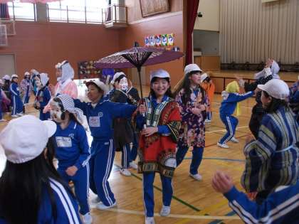 その後、昔の町人やお百姓さんのような着物とひょっとことおたふくのお面を貸してもらい、「ちびまる子ちゃん」のテーマソングでみんな一緒に踊りました。運動量があり、体育館の寒さも忘れてみんな汗をかきながら楽しく踊っていました。