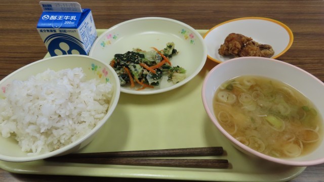 今日の給食メニューは、麦ごはん、鶏肉の竜田揚げ、ほうれん草の胡麻和え、エノキタケの味噌汁、牛乳です。今日は寒い1日でした。温かい味噌汁がおいしく感じました。今週末には河内フェスタが控えています。温かい食べ物や服装を意識して元気に当日を迎えたいですね。