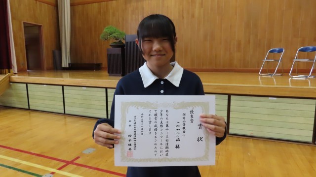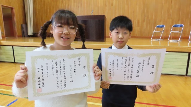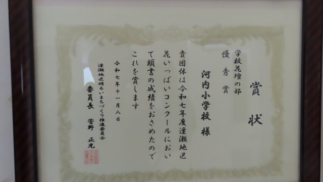 昨日までの2日間、逢瀬地区市民文化祭が行われました。その中で、「地区花いっぱい運動」の表彰式と、「標語」「少年の主張」コンクールの表彰及び発表会が行われました。「地区花いっぱい運動」の表彰式では、河内小学校が「学校花壇の部」において、優秀賞を受賞いたしました。また、「標語コンクール」と「少年の主張コンクール」の表彰では、本校からも多くの子どもたちが入賞することができました。文化祭の中では、代表児童が「少年の主張」を行いました。また、受賞代表児童が賞状を受け取りました。作文や標語には、ふるさと逢瀬町や河内小学校へのそれぞれの思いが上手に込められていました。