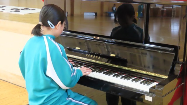 休み時間の体育館で、式の中で歌う曲の伴奏を練習するお友達が見られました。この曲が聞こえてくると年度末が近づいていることを感じます。また、閉校式の看板ができました。とても立派な看板です。少しずつ卒業式や閉校式が近づいてきています。