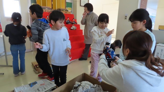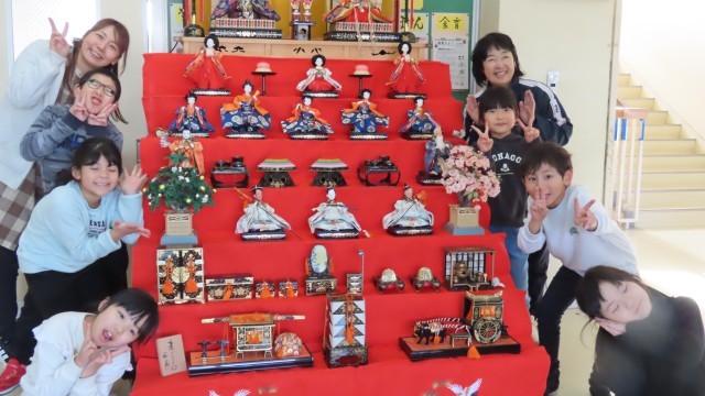 先週は昇降口に鬼が登場しましたが、今週は雛飾りが登場しました。1・2年生の子どもたちがお手伝いをして、ひな人形を飾ってくれました。御来校の際にはぜひゆっくりとご覧ください。