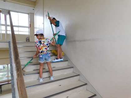本校では,縦割り班編制でお掃除をしています。6年生が1年生に仕事を教えるなど,上級生の関わり方がとても上手です。少ない児童数ですが,全員で協力しきれいな学校にしています。