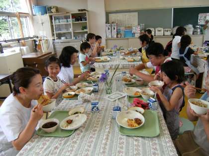 1年生から6年生まで縦割り班のグループで楽しくおいしい給食をいただくことができました。