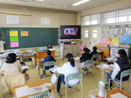 はじめに、会津本郷焼の概要についてYouTubeの「会津本郷焼 伝統の灯を次世代につなぐ」を見てから、「会津美里町 本郷地域まちあるきMAP」を使いながら、子どもたちの質問に答えていきました。会津本郷焼は本郷地域に焼き物に適した土が取れたことから始まったこと、現在は13の窯元があること、磁器も陶器もある珍しい焼き物の産地であることなどについて話しました。