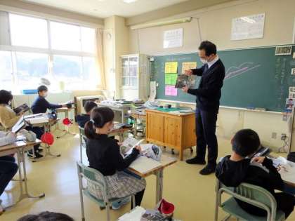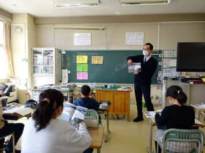 4年生の3校時は社会科で、「焼き物をつくるまち」の学習でした。今日は、長年、本郷地区の学校に勤めていた校長がゲストティーチャーとして授業をしました。