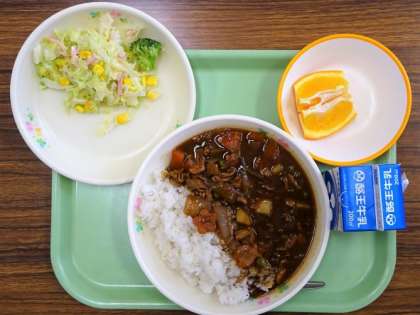 今日の給食の献立は、ハヤシライス、コーンサラダ、伊予柑、牛乳でした。