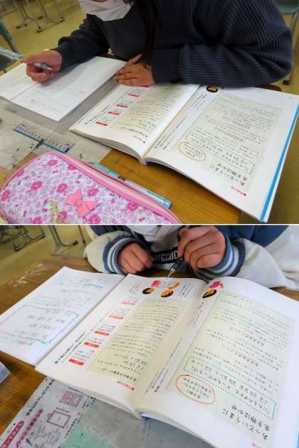 5年生の1校時は国語で、「この本おすすめします」の学習をしていました。教科書の例文を参考に紹介文を書いていました。