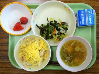 今日の給食の献立は、ひな祭り献立で、ちらしずし、笹かまと野菜のごまみそ和え、しめじのすまし汁、イチゴ、牛乳でした。