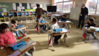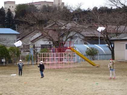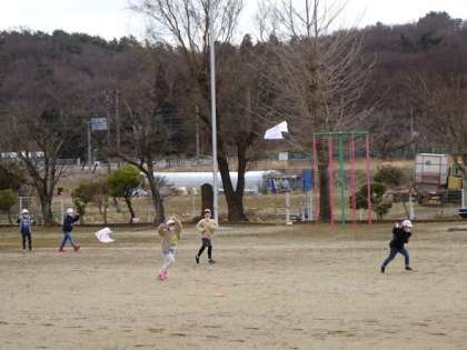 今日の昼休み気温は低かったのですが、元気に校庭で遊ぶ子友だちの姿が見られました。1年生は先日に引き続き、凧揚げを楽しんでいました。程よい西風があったので、よく揚がっていました。