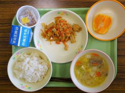 今日の給食の献立は、麦ごはん、納豆、切干大根の含め煮、トック入りわかめスープ、不知火でした。