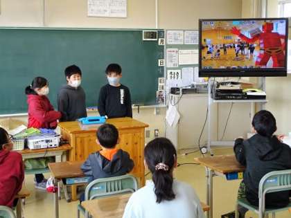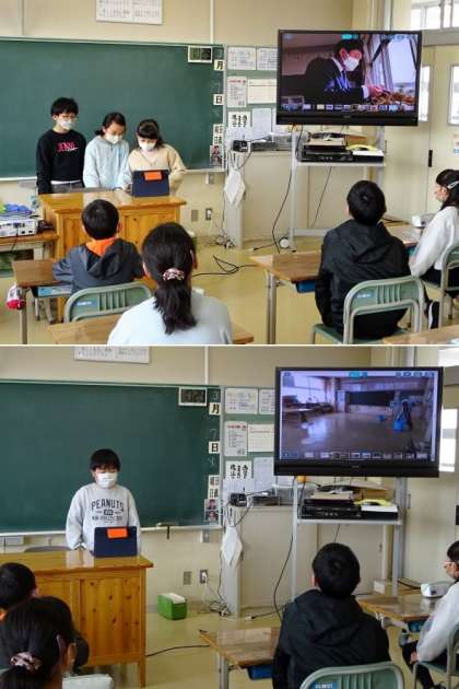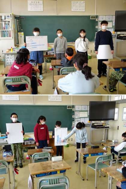 3・4年生の1校時は国語で、3年生の「学校自まん」と4年生の「アンケート調査」についての合同発表会を行いました。3年生にとっても4年生にとってもよい発表会となりました。