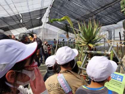 また、今話題となっているリュウゼツランの『アガベ』の花も見てきました。平日でしたが、全国ニュースで報道されていることもあって、駐車場は満車で、多くの人が『アガベ』めあてに来ていました。
