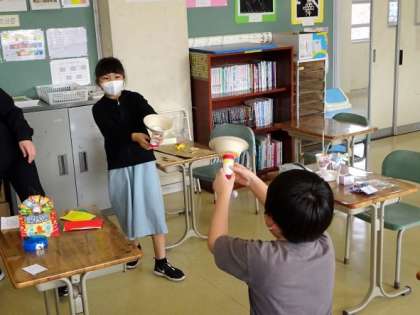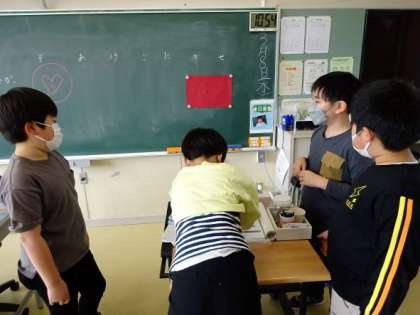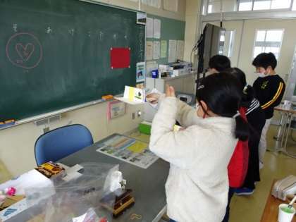 3年生の3校時は理科で、前回に引き続き、3年で学習したことを利用して使ったおもちゃで遊んでいました。前回の課題を修正し、楽しく遊んでいました。