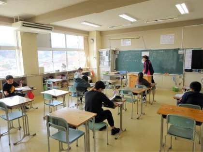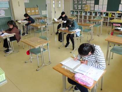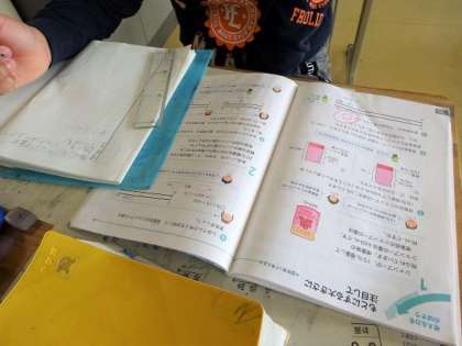 5年生の3校時は算数で、「考える力をのばそう『もとにする大きさに注目して』」の学習をしていました。訪問した時は、2問目の「あるノートが、大きさ、ページ数は変えずに20%軽量化されて新たに発売されました。軽量化後のノートの重さは96グラムです。軽量化前は何グラムですか。」という問題を考えていました。この問題は軽量化前の数値を求めるため、図にかきながら考えていました。