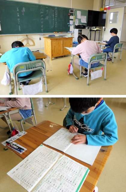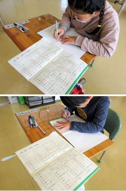 1年生の4校時は国語で、漢字練習に取り組んでいました。習った漢字を正しい書き順で書く練習をしていました。