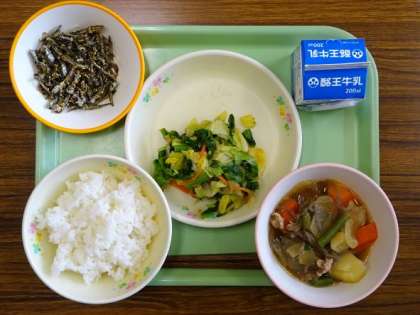 今日の給食の献立は、ご飯、青のり小魚、くきたち菜のおひたし、肉じゃが、牛乳でした。