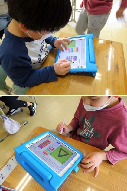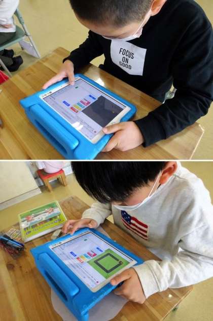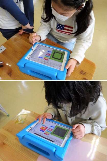 1・2年生の1校時は算数でした。今日は、タブレットを使って、プログラミングに挑戦していました。