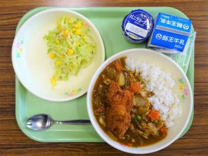 今日の給食の献立は、カツカレーライス、コーンサラダ、ヨーグルト、牛乳でした。