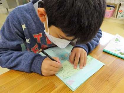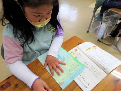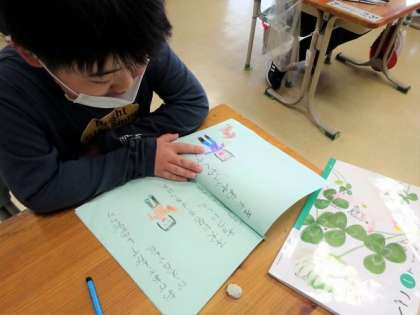 1年生の1校時は国語で、自分たちでかいた絵本を互いに読み合い感想を送り合っていました。