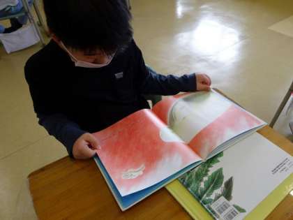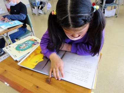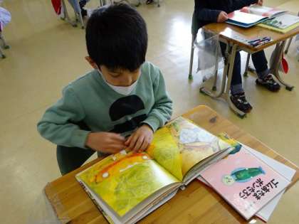 1年生の1校時は国語でした。今日は、読書タイムで、図書室からそれぞれ何冊かの絵本を借りてきて読んでいました。とても楽しい絵の絵本ばかりでした。