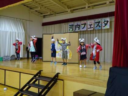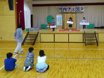 1・2年生の2校時は河内フェスタの練習でした。1年生によるはじめの言葉や1・2年生の発表の練習をしていました。6人ともとても楽しそうに練習に取り組んでいました。21日の本番が楽しみです。