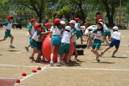 3〜6年生の団体種目です。互いの陣地に分かれ、紅白玉、タイヤ、紅白大玉を陣地まで運び合います。紅白玉は1点、タイヤは2点、紅白大玉はなんと5点です。結果は、白組が勝ちました。