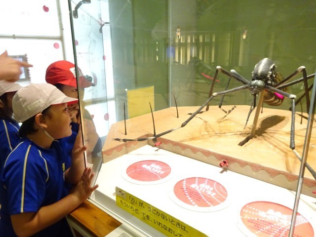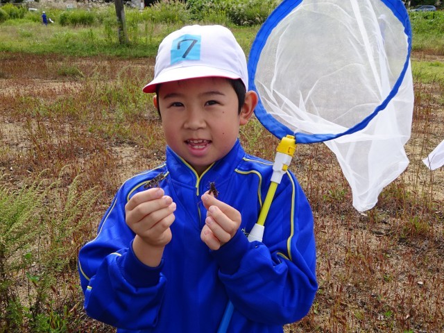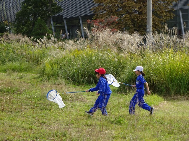 1時目はなぜだろうランドで展示見学。大きな模型や展示物を通して、楽しく虫の生態を学びました。2時目は外で虫探し。虫取り網を持って広場を駆け回り、バッタやちょう、とんぼなど、たくさんの虫を捕まえました。