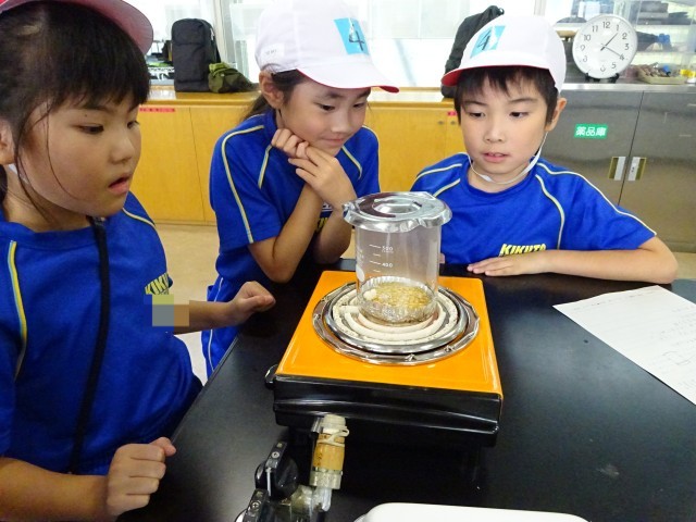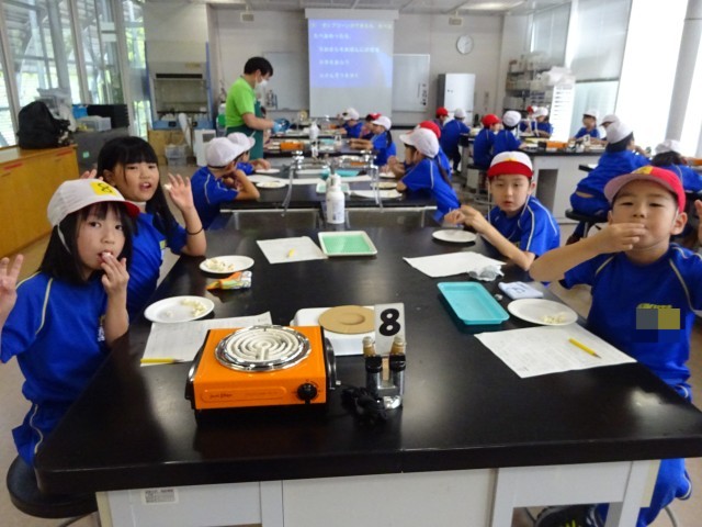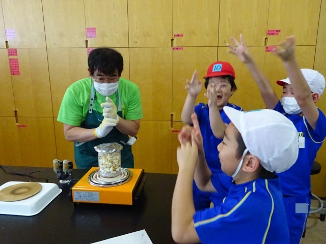 午前中の活動を終えて、美味しいお弁当をいただいた2年生。4時目は最後の活動、ビーカーポップコーンです。どのようにしてポップコーンができるのか、予想を立てながら実験を行いました。ポップコーンがはじける度に、子どもたちの笑顔もはじけます。最後は、出来上がったポップコーンを試食して大満足!!