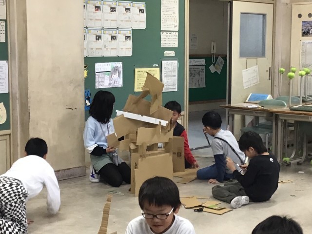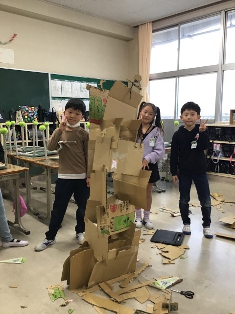 今日の図画工作は「クミクミックス」でした。段ボール切ったり組み合わせたりして、グループで協力して作品を作りました。みんなで造形活動を楽しみました。