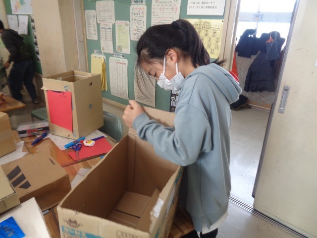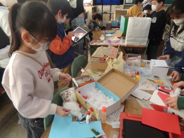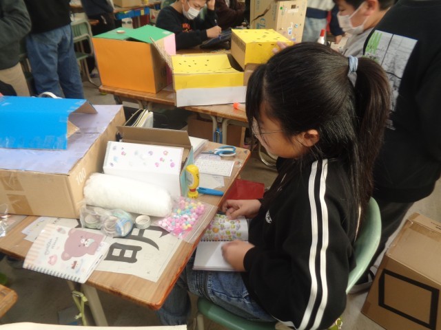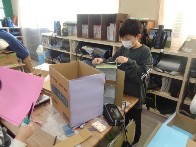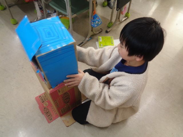 段ボールを使って自分だけのオリジナルボックス作りを行いました。「宝物をしまいたい。」「文房具を片付けたい。」とそれぞれ何に使いたいか考えながら制作していました。