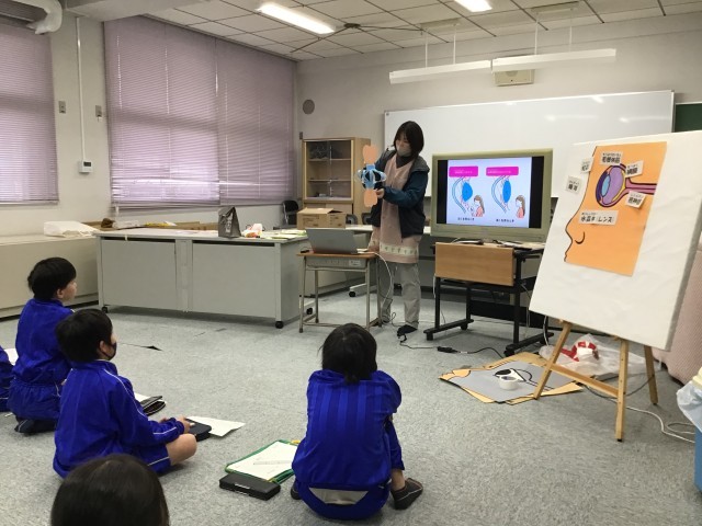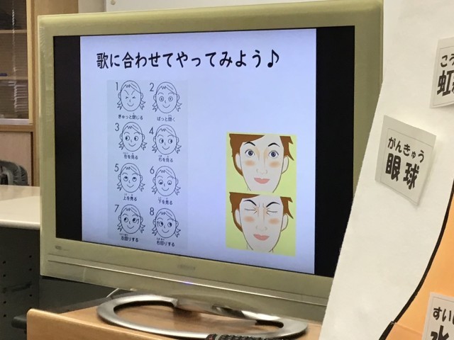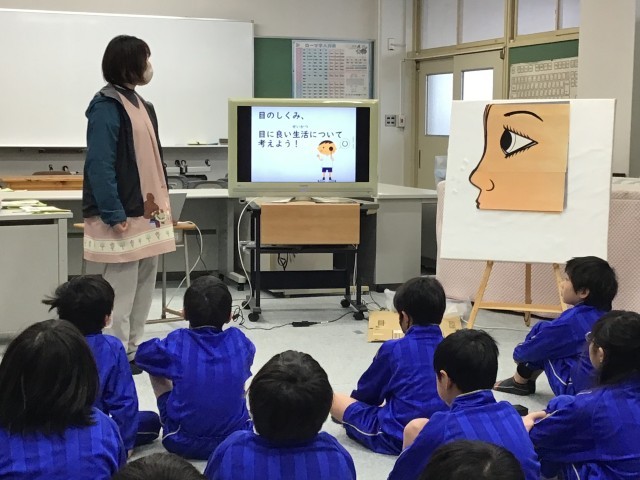 14日身体測定の後、養護の坪井先生に、目のお話しをしていただきました。眼球の模型を使いながら、近くを見続けると目の奥の筋肉が疲れてしまうことを分かりやすく教えていただいた後、目の体操をしました。30分に一回は画面から目を離し、遠くを見るか目の運動をしましょう。