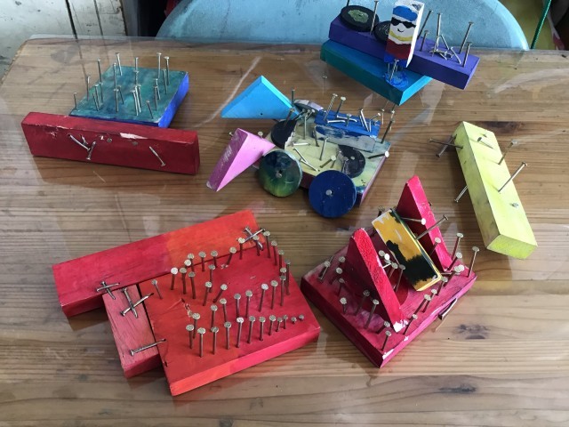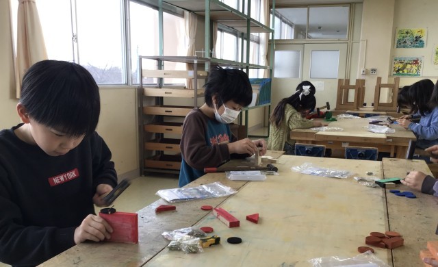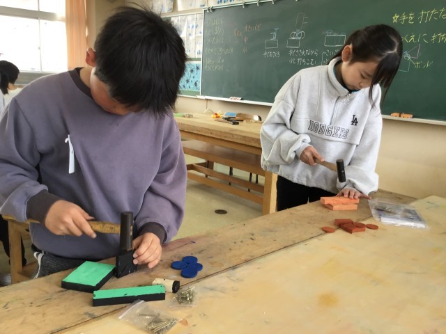 図画工作の「トントン どんどん くぎうって」の授業で、木材に釘をうちました。初めて金づちを使った児童が多く、真っ直ぐ打てなかったり、手を打ちそうになったりと苦労しながらも作品作りました。
