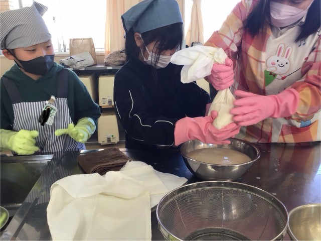 17日に総合で育ててきた大豆を使い、豆腐を作りました。JAさくらの熊田さんをはじめとし、6人もの方がお手伝いにきてくださいました。前日から水につけていた大豆をミキサーにかけ、煮立ててから絞りとたくさんの手順を経てできたお豆腐。おいしさも格別だったようです。今までお世話になった佐藤さん、JAのみなさん、ありがとうございました。