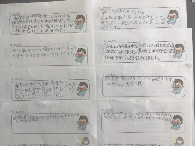 養護教諭の坪井先生による「赤ちゃんの誕生」の授業を行いました。プライベートゾーンや男女の体の違いお話しの後、胎児が成長していく様子を写真と共に教えていただきました。大きさも具体的に教えてもらい、その小ささや10ヶ月という時間の長さに驚いていました。今まで以上に、命を大切にしてほしいと思います。坪井先生からの宿題、できましたか?