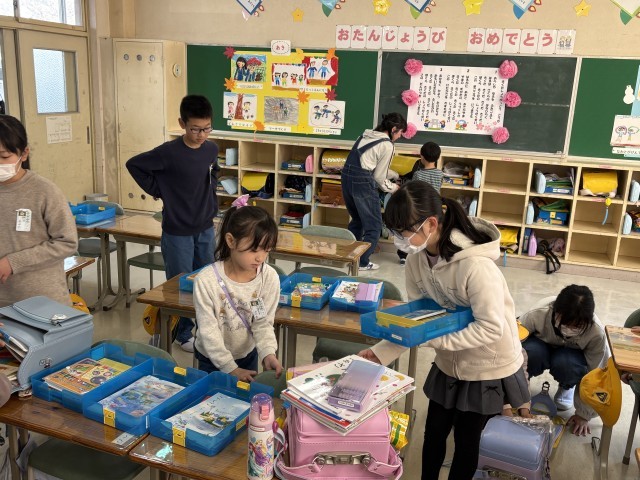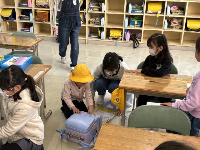 ランドセルの中身を出したり、名札をつけてあげたりしています。
