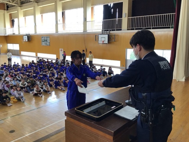 今日は喜久田駐在所の方をお招きして、「家庭の交通安全推進員委嘱状」の交付式を行いました。