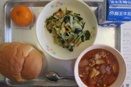 今日の給食の献立は バターロール 牛乳 豚肉と大豆のケチャップ煮 わかめと野菜のサラダ 冷凍みかん です。エネルギーは 642kcalです。