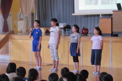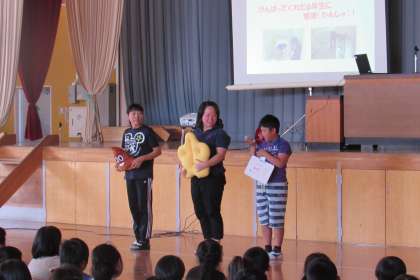 校長の話の後、保健委員会の子どもたち(+担当の先生)が「トイレの使い方」についての発表を行いました。