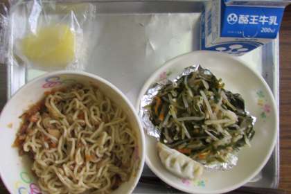 今日の給食の献立は ジャージャーめん 牛乳 蒸しぎょうざ りんごシャーベット すき昆布の香味あえ です。エネルギーは 641kcalです。