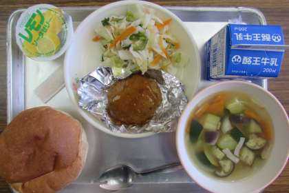 給食最終日の献立は バンズパン コールスローサラダ ハンバーグ照り焼きソース 牛乳 夏野菜のスープ デザート(レモンソーダゼリー)です。エネルギーは 599kcalです。