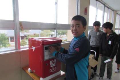 今日は、喜久田郵便局の局長さんが学校までポストを持ってきてくださいました。
